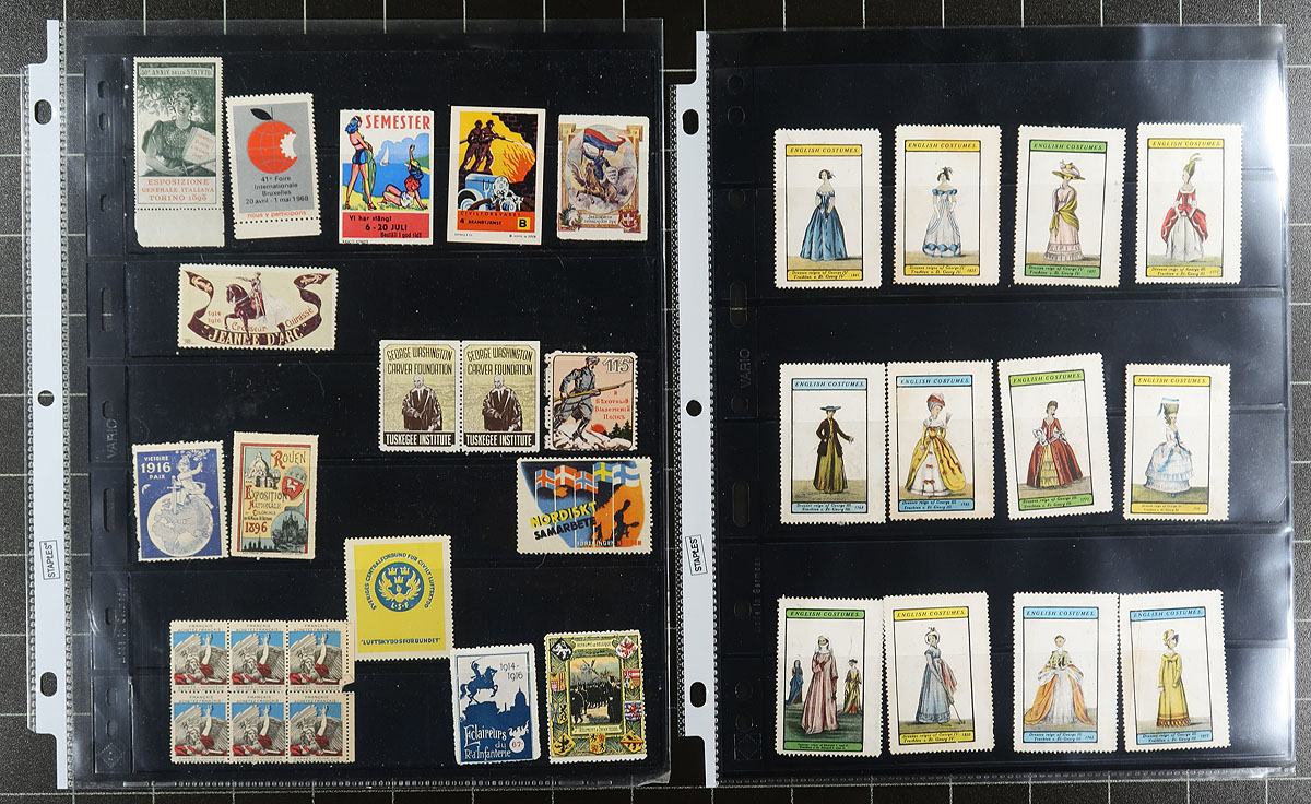 Lovely accumulation of worldwide seals and labels, 1920's-1990's, containing many hundreds of items housed in a binder. A cursory check showed material from Canada, United States, European countries, and a few other regions, noting singles, sets, blocks, panes, and more, consisting of local and international stamp shows and exhibitions, Christmas seals, wildlife labels and other society funding labels, and much. We note many interesting areas of interest for the cinderella, topical and thematic collector including "Local Dog Post" from Shrub Oak, New York. All pages photographed online. Estimate =