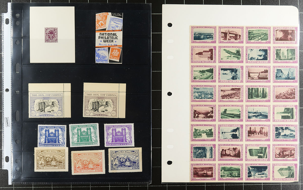 Lovely accumulation of worldwide seals and labels, 1920's-1990's, containing many hundreds of items housed in a binder. A cursory check showed material from Canada, United States, European countries, and a few other regions, noting singles, sets, blocks, panes, and more, consisting of local and international stamp shows and exhibitions, Christmas seals, wildlife labels and other society funding labels, and much. We note many interesting areas of interest for the cinderella, topical and thematic collector including "Local Dog Post" from Shrub Oak, New York. All pages photographed online. Estimate =