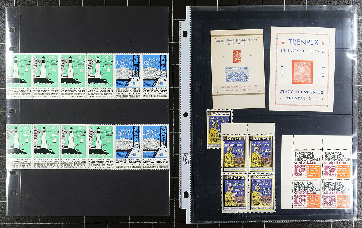 Lovely accumulation of worldwide seals and labels, 1920's-1990's, containing many hundreds of items housed in a binder. A cursory check showed material from Canada, United States, European countries, and a few other regions, noting singles, sets, blocks, panes, and more, consisting of local and international stamp shows and exhibitions, Christmas seals, wildlife labels and other society funding labels, and much. We note many interesting areas of interest for the cinderella, topical and thematic collector including "Local Dog Post" from Shrub Oak, New York. All pages photographed online. Estimate =