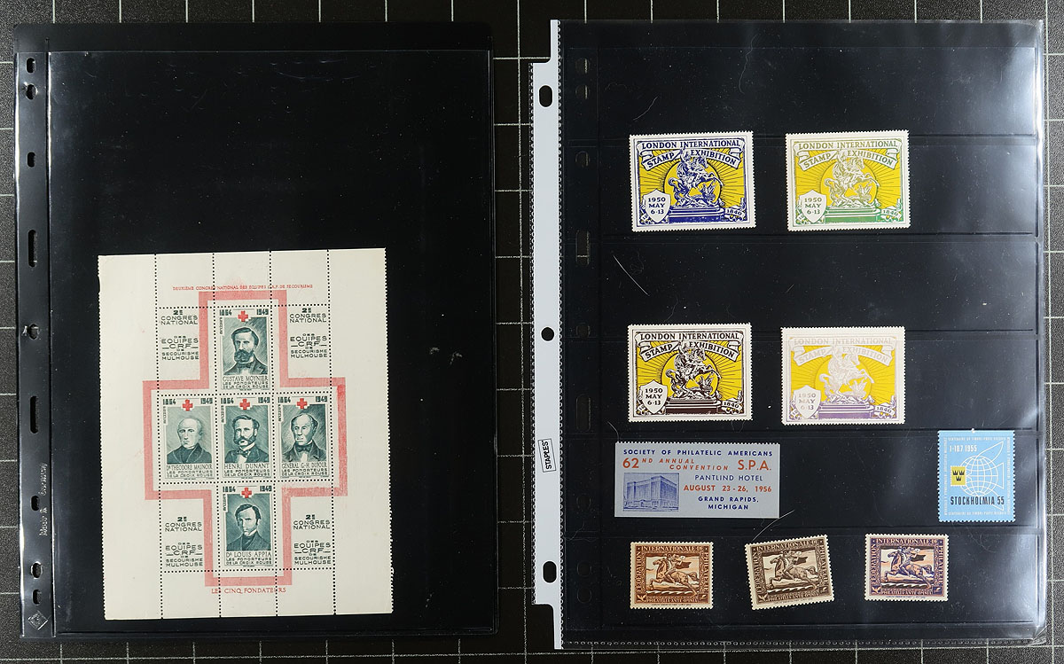 Lovely accumulation of worldwide seals and labels, 1920's-1990's, containing many hundreds of items housed in a binder. A cursory check showed material from Canada, United States, European countries, and a few other regions, noting singles, sets, blocks, panes, and more, consisting of local and international stamp shows and exhibitions, Christmas seals, wildlife labels and other society funding labels, and much. We note many interesting areas of interest for the cinderella, topical and thematic collector including "Local Dog Post" from Shrub Oak, New York. All pages photographed online. Estimate =