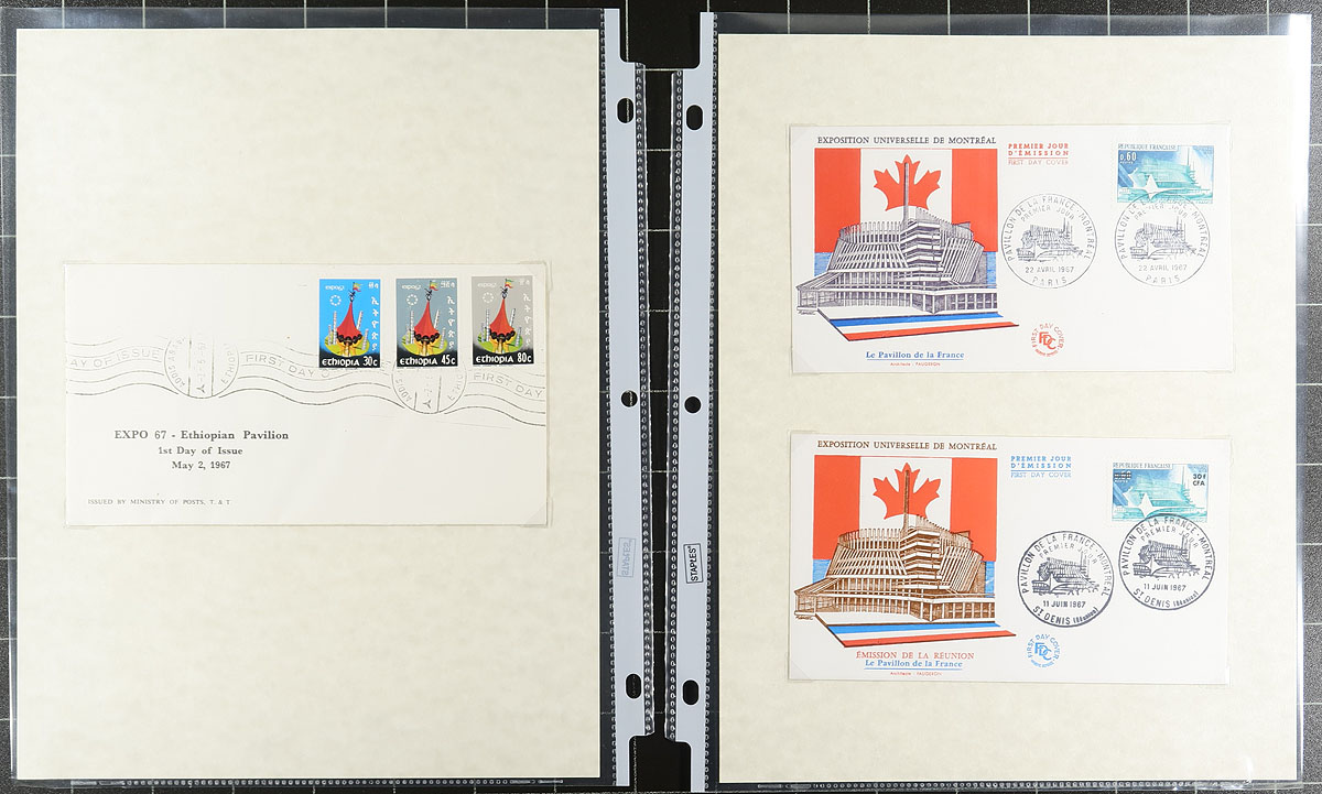 Expo 1967 Topical collection. A clean collection of 'Expo 67' worldwide covers, containing 70 items neatly arranged on homemade pages in a binder. We note singles, sets, and souvenir sheet frankings, many having the Expo logo in the stamp design, along with several colourful cachets, pavilion postmarks, etc. A nice clean lot for topical and thematic collectors from this important time in Canada's history. Estimate =