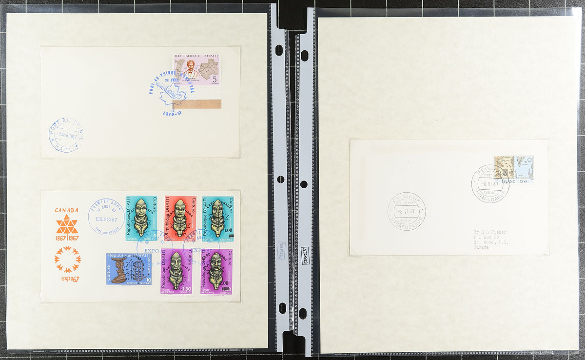 Expo 1967 Topical collection. A clean collection of 'Expo 67' worldwide covers, containing 70 items neatly arranged on homemade pages in a binder. We note singles, sets, and souvenir sheet frankings, many having the Expo logo in the stamp design, along with several colourful cachets, pavilion postmarks, etc. A nice clean lot for topical and thematic collectors from this important time in Canada's history. Estimate =
