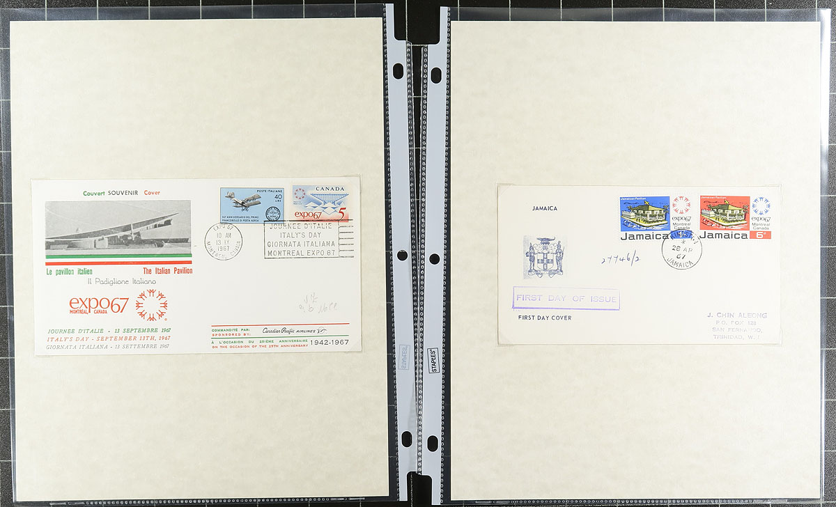 Expo 1967 Topical collection. A clean collection of 'Expo 67' worldwide covers, containing 70 items neatly arranged on homemade pages in a binder. We note singles, sets, and souvenir sheet frankings, many having the Expo logo in the stamp design, along with several colourful cachets, pavilion postmarks, etc. A nice clean lot for topical and thematic collectors from this important time in Canada's history. Estimate =
