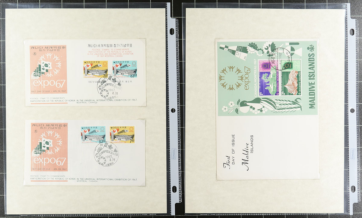 Expo 1967 Topical collection. A clean collection of 'Expo 67' worldwide covers, containing 70 items neatly arranged on homemade pages in a binder. We note singles, sets, and souvenir sheet frankings, many having the Expo logo in the stamp design, along with several colourful cachets, pavilion postmarks, etc. A nice clean lot for topical and thematic collectors from this important time in Canada's history. Estimate =