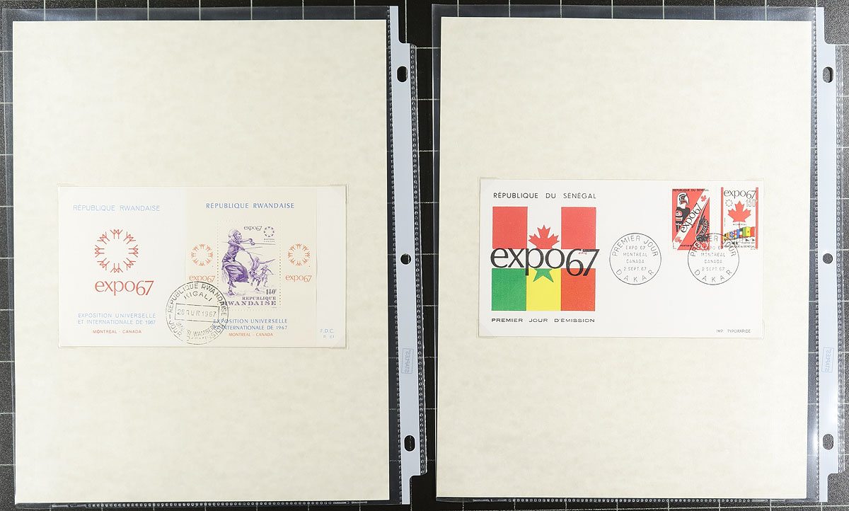 Expo 1967 Topical collection. A clean collection of 'Expo 67' worldwide covers, containing 70 items neatly arranged on homemade pages in a binder. We note singles, sets, and souvenir sheet frankings, many having the Expo logo in the stamp design, along with several colourful cachets, pavilion postmarks, etc. A nice clean lot for topical and thematic collectors from this important time in Canada's history. Estimate =