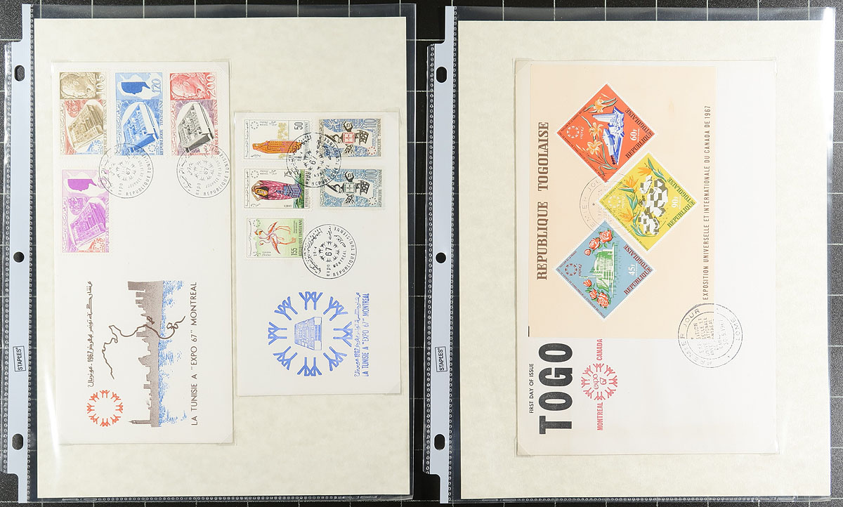 Expo 1967 Topical collection. A clean collection of 'Expo 67' worldwide covers, containing 70 items neatly arranged on homemade pages in a binder. We note singles, sets, and souvenir sheet frankings, many having the Expo logo in the stamp design, along with several colourful cachets, pavilion postmarks, etc. A nice clean lot for topical and thematic collectors from this important time in Canada's history. Estimate =