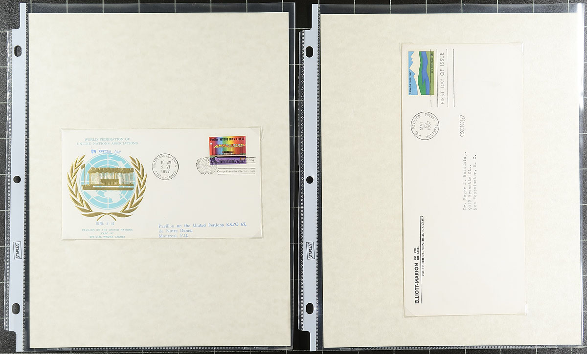 Expo 1967 Topical collection. A clean collection of 'Expo 67' worldwide covers, containing 70 items neatly arranged on homemade pages in a binder. We note singles, sets, and souvenir sheet frankings, many having the Expo logo in the stamp design, along with several colourful cachets, pavilion postmarks, etc. A nice clean lot for topical and thematic collectors from this important time in Canada's history. Estimate =