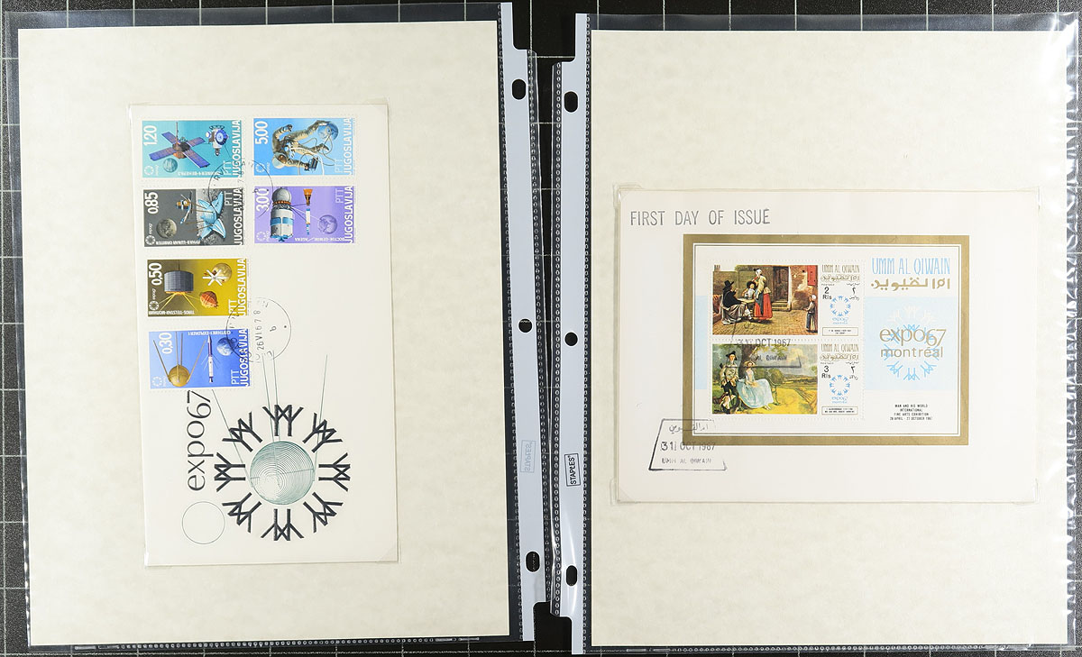 Expo 1967 Topical collection. A clean collection of 'Expo 67' worldwide covers, containing 70 items neatly arranged on homemade pages in a binder. We note singles, sets, and souvenir sheet frankings, many having the Expo logo in the stamp design, along with several colourful cachets, pavilion postmarks, etc. A nice clean lot for topical and thematic collectors from this important time in Canada's history. Estimate =