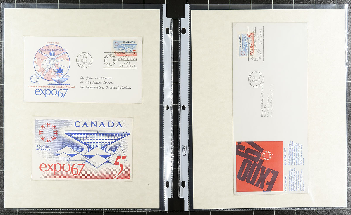 Expo 1967 Topical collection. A clean collection of 'Expo 67' worldwide covers, containing 70 items neatly arranged on homemade pages in a binder. We note singles, sets, and souvenir sheet frankings, many having the Expo logo in the stamp design, along with several colourful cachets, pavilion postmarks, etc. A nice clean lot for topical and thematic collectors from this important time in Canada's history. Estimate =