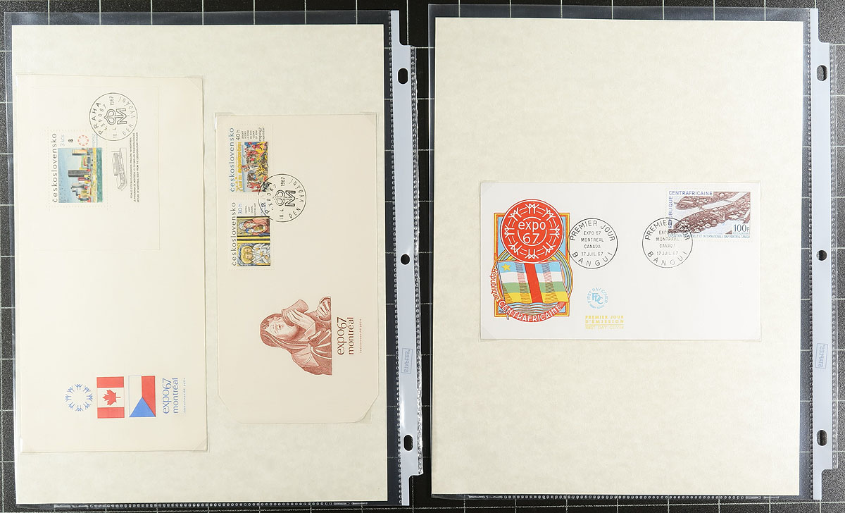 Expo 1967 Topical collection. A clean collection of 'Expo 67' worldwide covers, containing 70 items neatly arranged on homemade pages in a binder. We note singles, sets, and souvenir sheet frankings, many having the Expo logo in the stamp design, along with several colourful cachets, pavilion postmarks, etc. A nice clean lot for topical and thematic collectors from this important time in Canada's history. Estimate =