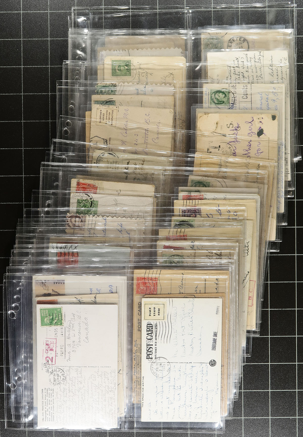 Nice group of Canada and worldwide postcards with postage due stamps and markings, 1900's-1960's, containing 54 cards neatly arranged in a small cover album. We spotted mostly stamps or markings applied in Canada or Great Britain, along with a few other mostly European countries, with a good variety of rates and fees to be paid. A nice specialty lot for the rate, postage due, or postcard collector. Estimate =
