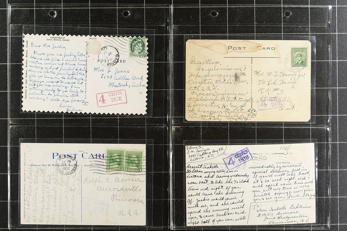 Nice group of Canada and worldwide postcards with postage due stamps and markings, 1900's-1960's, containing 54 cards neatly arranged in a small cover album. We spotted mostly stamps or markings applied in Canada or Great Britain, along with a few other mostly European countries, with a good variety of rates and fees to be paid. A nice specialty lot for the rate, postage due, or postcard collector. Estimate =
