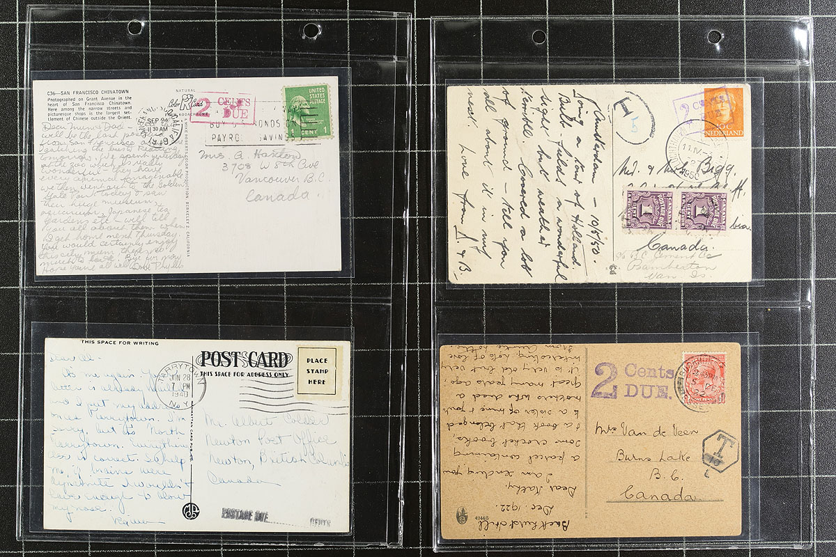 Nice group of Canada and worldwide postcards with postage due stamps and markings, 1900's-1960's, containing 54 cards neatly arranged in a small cover album. We spotted mostly stamps or markings applied in Canada or Great Britain, along with a few other mostly European countries, with a good variety of rates and fees to be paid. A nice specialty lot for the rate, postage due, or postcard collector. Estimate =
