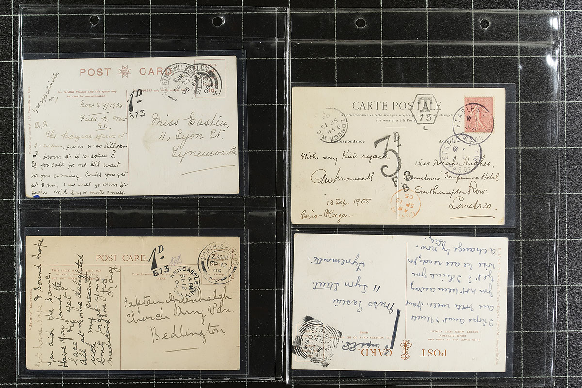 Nice group of Canada and worldwide postcards with postage due stamps and markings, 1900's-1960's, containing 54 cards neatly arranged in a small cover album. We spotted mostly stamps or markings applied in Canada or Great Britain, along with a few other mostly European countries, with a good variety of rates and fees to be paid. A nice specialty lot for the rate, postage due, or postcard collector. Estimate =