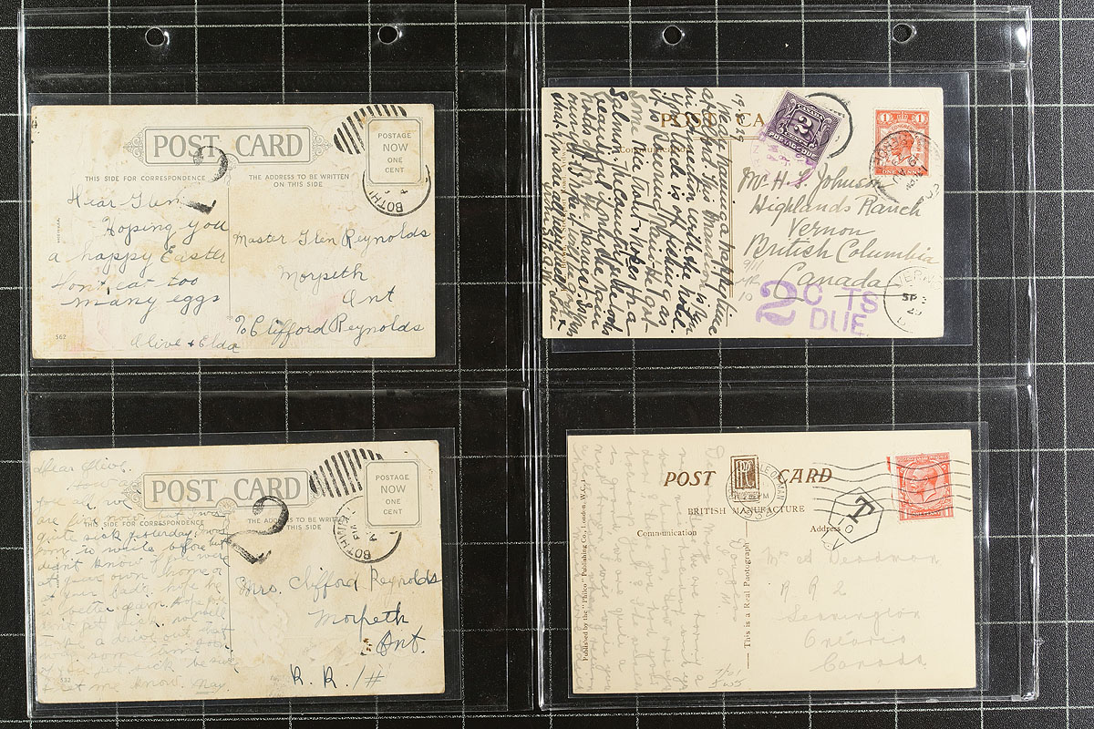 Nice group of Canada and worldwide postcards with postage due stamps and markings, 1900's-1960's, containing 54 cards neatly arranged in a small cover album. We spotted mostly stamps or markings applied in Canada or Great Britain, along with a few other mostly European countries, with a good variety of rates and fees to be paid. A nice specialty lot for the rate, postage due, or postcard collector. Estimate =