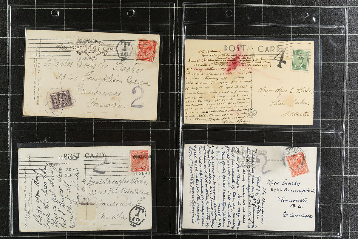 Nice group of Canada and worldwide postcards with postage due stamps and markings, 1900's-1960's, containing 54 cards neatly arranged in a small cover album. We spotted mostly stamps or markings applied in Canada or Great Britain, along with a few other mostly European countries, with a good variety of rates and fees to be paid. A nice specialty lot for the rate, postage due, or postcard collector. Estimate =
