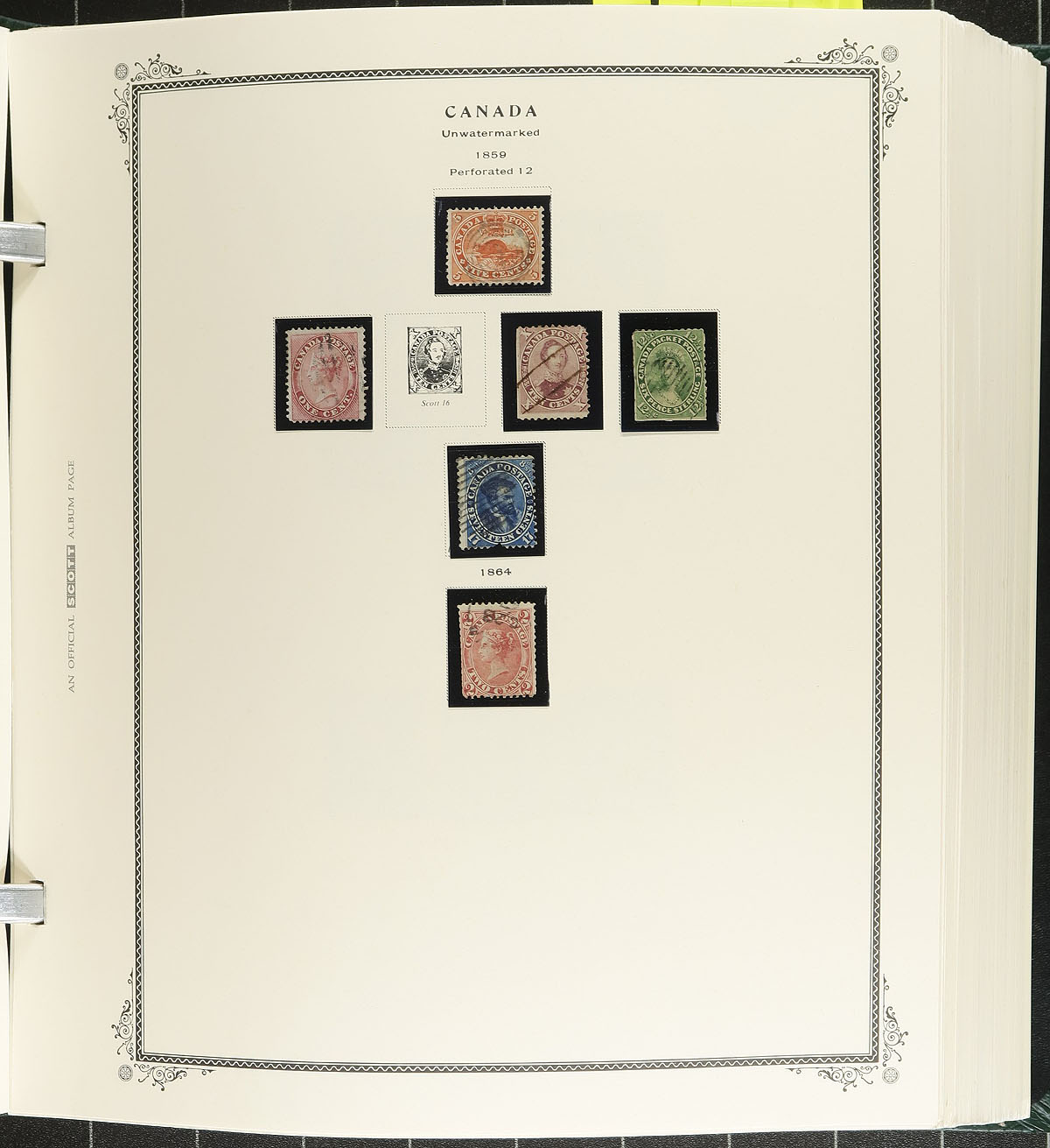 Collection of mint and used Canada in a Scott Specialty album, 1859-1995. This well organized collection ranges from Scott #14/1583, beginning with used classics with Scott #s 14-15, 17-20, Large Queens (x10, 1/2c to 15c), Small Queens (x16, including 10c (x2), 20c and 50c Widow Weeds), Jubilees from 1/2c to 50c, along with mint and or used sets of Quebecs, Admirals (noting several mint coils), Scrolls (used 50c Bluenose, and mh $1 Parliament), Arch, Pictorials, War, and mint hinged set of Peace issues. The continues with a near complete collection of primarily never hinged issues from 1952 to 1995, including souvenir sheets, panes, coils, and tagged issues. A spot check indicated some stamps cataloguing $10 to $25 and up, with face value alone in excess of $400. Some of the early stamps have small faults including trimmed perfs, small thins, or have no gum, with the majority of stamps being fine to very fine. A potentially high cataloguing collection and should be continued until complete, online photos show a sampling. Estimate =