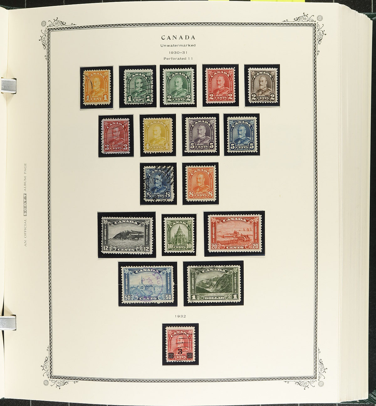 Collection of mint and used Canada in a Scott Specialty album, 1859-1995. This well organized collection ranges from Scott #14/1583, beginning with used classics with Scott #s 14-15, 17-20, Large Queens (x10, 1/2c to 15c), Small Queens (x16, including 10c (x2), 20c and 50c Widow Weeds), Jubilees from 1/2c to 50c, along with mint and or used sets of Quebecs, Admirals (noting several mint coils), Scrolls (used 50c Bluenose, and mh $1 Parliament), Arch, Pictorials, War, and mint hinged set of Peace issues. The continues with a near complete collection of primarily never hinged issues from 1952 to 1995, including souvenir sheets, panes, coils, and tagged issues. A spot check indicated some stamps cataloguing $10 to $25 and up, with face value alone in excess of $400. Some of the early stamps have small faults including trimmed perfs, small thins, or have no gum, with the majority of stamps being fine to very fine. A potentially high cataloguing collection and should be continued until complete, online photos show a sampling. Estimate =