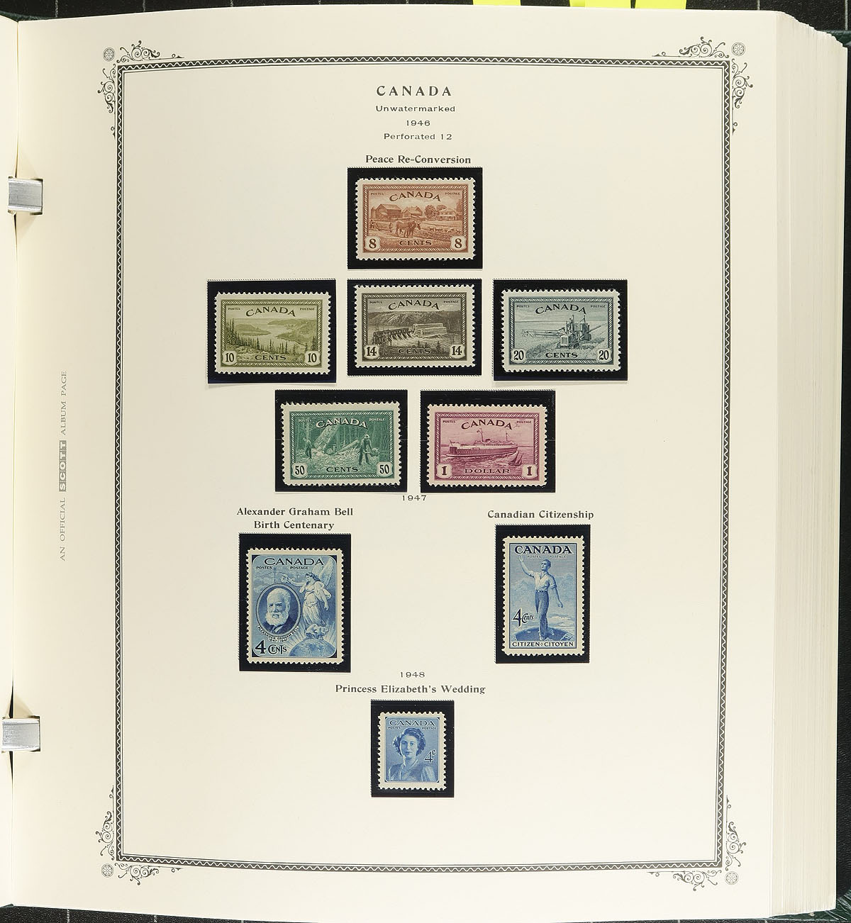 Collection of mint and used Canada in a Scott Specialty album, 1859-1995. This well organized collection ranges from Scott #14/1583, beginning with used classics with Scott #s 14-15, 17-20, Large Queens (x10, 1/2c to 15c), Small Queens (x16, including 10c (x2), 20c and 50c Widow Weeds), Jubilees from 1/2c to 50c, along with mint and or used sets of Quebecs, Admirals (noting several mint coils), Scrolls (used 50c Bluenose, and mh $1 Parliament), Arch, Pictorials, War, and mint hinged set of Peace issues. The continues with a near complete collection of primarily never hinged issues from 1952 to 1995, including souvenir sheets, panes, coils, and tagged issues. A spot check indicated some stamps cataloguing $10 to $25 and up, with face value alone in excess of $400. Some of the early stamps have small faults including trimmed perfs, small thins, or have no gum, with the majority of stamps being fine to very fine. A potentially high cataloguing collection and should be continued until complete, online photos show a sampling. Estimate =