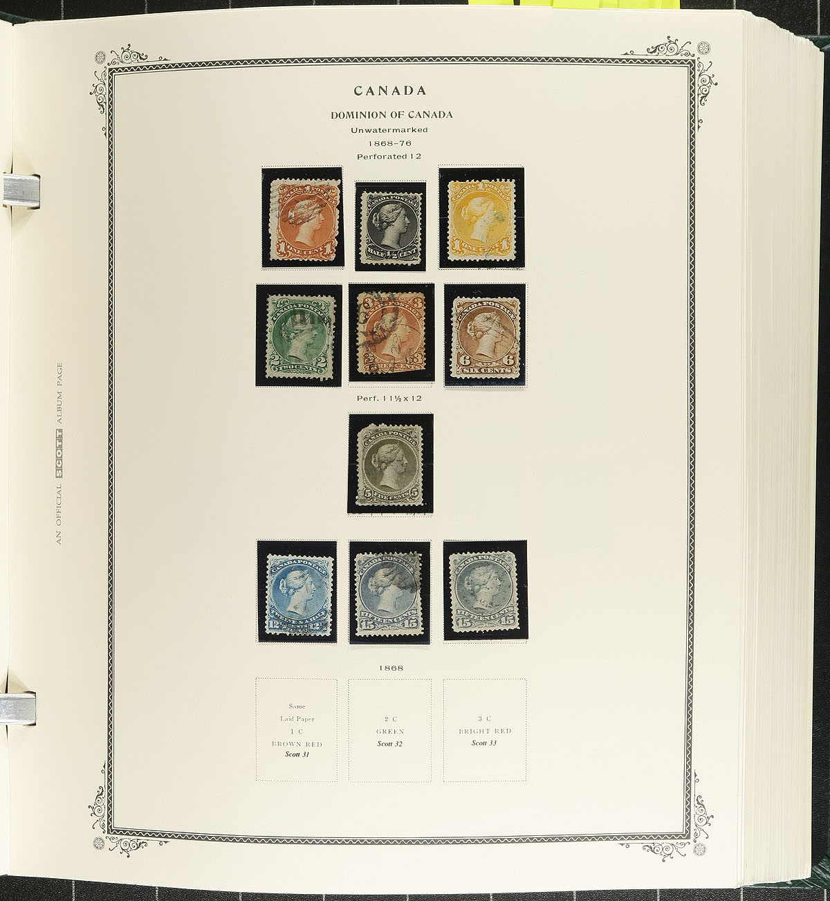 Collection of mint and used Canada in a Scott Specialty album, 1859-1995. This well organized collection ranges from Scott #14/1583, beginning with used classics with Scott #s 14-15, 17-20, Large Queens (x10, 1/2c to 15c), Small Queens (x16, including 10c (x2), 20c and 50c Widow Weeds), Jubilees from 1/2c to 50c, along with mint and or used sets of Quebecs, Admirals (noting several mint coils), Scrolls (used 50c Bluenose, and mh $1 Parliament), Arch, Pictorials, War, and mint hinged set of Peace issues. The continues with a near complete collection of primarily never hinged issues from 1952 to 1995, including souvenir sheets, panes, coils, and tagged issues. A spot check indicated some stamps cataloguing $10 to $25 and up, with face value alone in excess of $400. Some of the early stamps have small faults including trimmed perfs, small thins, or have no gum, with the majority of stamps being fine to very fine. A potentially high cataloguing collection and should be continued until complete, online photos show a sampling. Estimate =