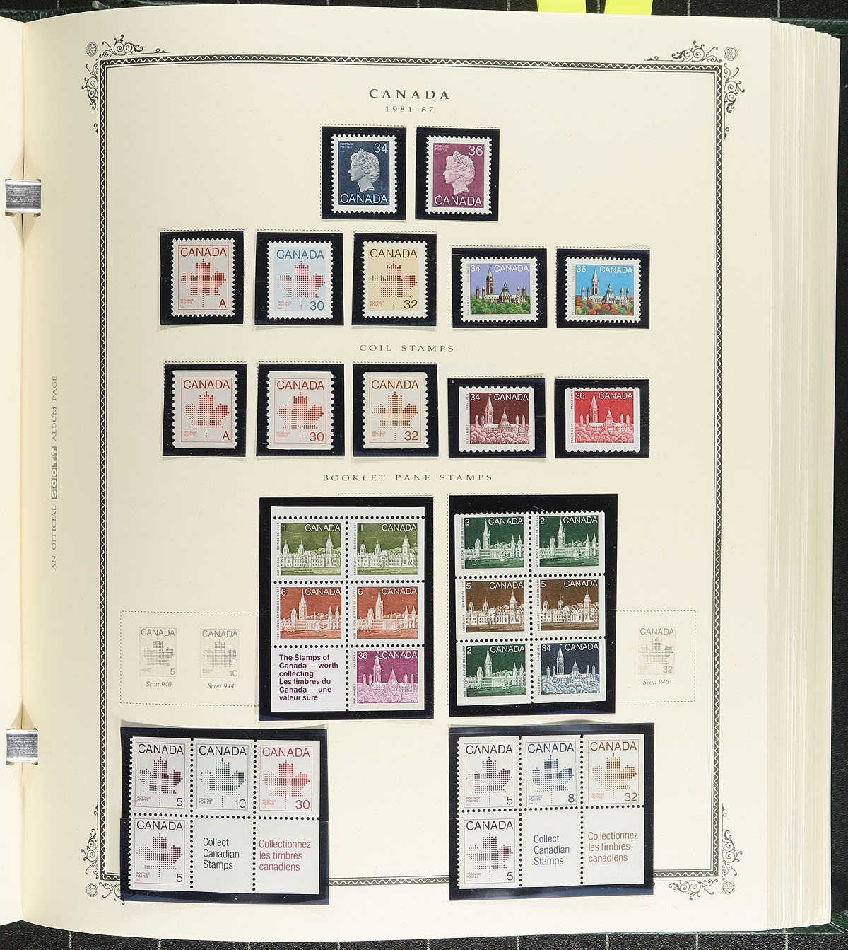 Collection of mint and used Canada in a Scott Specialty album, 1859-1995. This well organized collection ranges from Scott #14/1583, beginning with used classics with Scott #s 14-15, 17-20, Large Queens (x10, 1/2c to 15c), Small Queens (x16, including 10c (x2), 20c and 50c Widow Weeds), Jubilees from 1/2c to 50c, along with mint and or used sets of Quebecs, Admirals (noting several mint coils), Scrolls (used 50c Bluenose, and mh $1 Parliament), Arch, Pictorials, War, and mint hinged set of Peace issues. The continues with a near complete collection of primarily never hinged issues from 1952 to 1995, including souvenir sheets, panes, coils, and tagged issues. A spot check indicated some stamps cataloguing $10 to $25 and up, with face value alone in excess of $400. Some of the early stamps have small faults including trimmed perfs, small thins, or have no gum, with the majority of stamps being fine to very fine. A potentially high cataloguing collection and should be continued until complete, online photos show a sampling. Estimate =