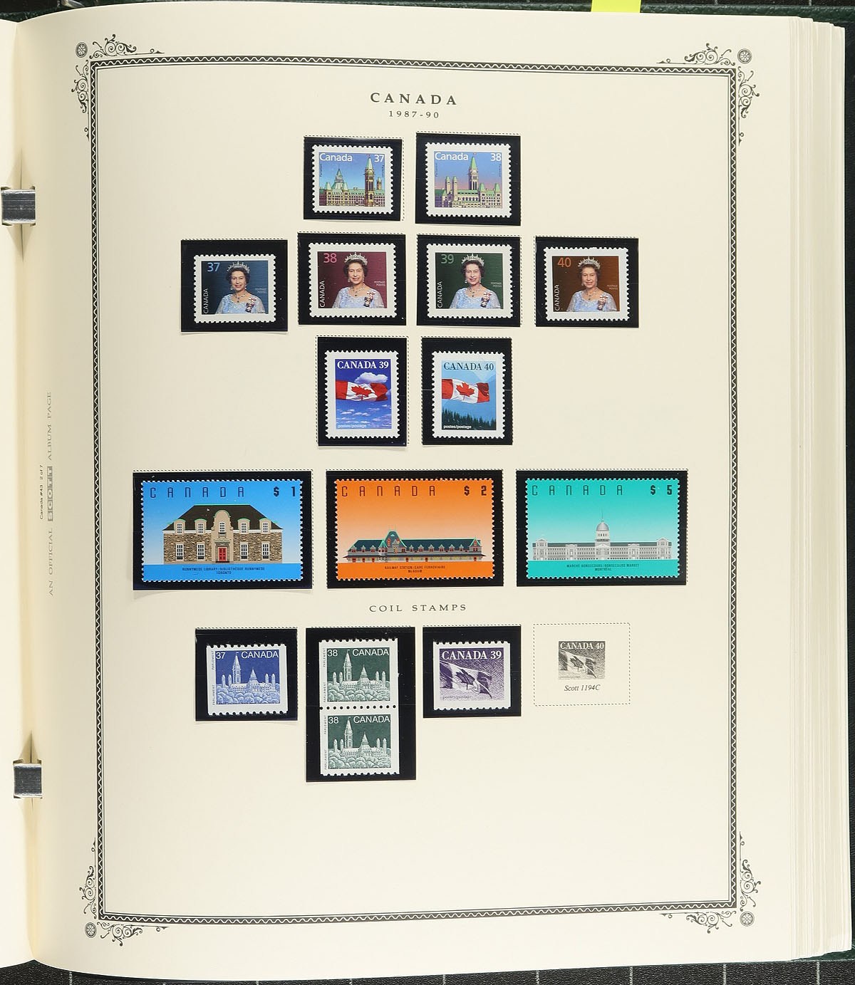 Collection of mint and used Canada in a Scott Specialty album, 1859-1995. This well organized collection ranges from Scott #14/1583, beginning with used classics with Scott #s 14-15, 17-20, Large Queens (x10, 1/2c to 15c), Small Queens (x16, including 10c (x2), 20c and 50c Widow Weeds), Jubilees from 1/2c to 50c, along with mint and or used sets of Quebecs, Admirals (noting several mint coils), Scrolls (used 50c Bluenose, and mh $1 Parliament), Arch, Pictorials, War, and mint hinged set of Peace issues. The continues with a near complete collection of primarily never hinged issues from 1952 to 1995, including souvenir sheets, panes, coils, and tagged issues. A spot check indicated some stamps cataloguing $10 to $25 and up, with face value alone in excess of $400. Some of the early stamps have small faults including trimmed perfs, small thins, or have no gum, with the majority of stamps being fine to very fine. A potentially high cataloguing collection and should be continued until complete, online photos show a sampling. Estimate =