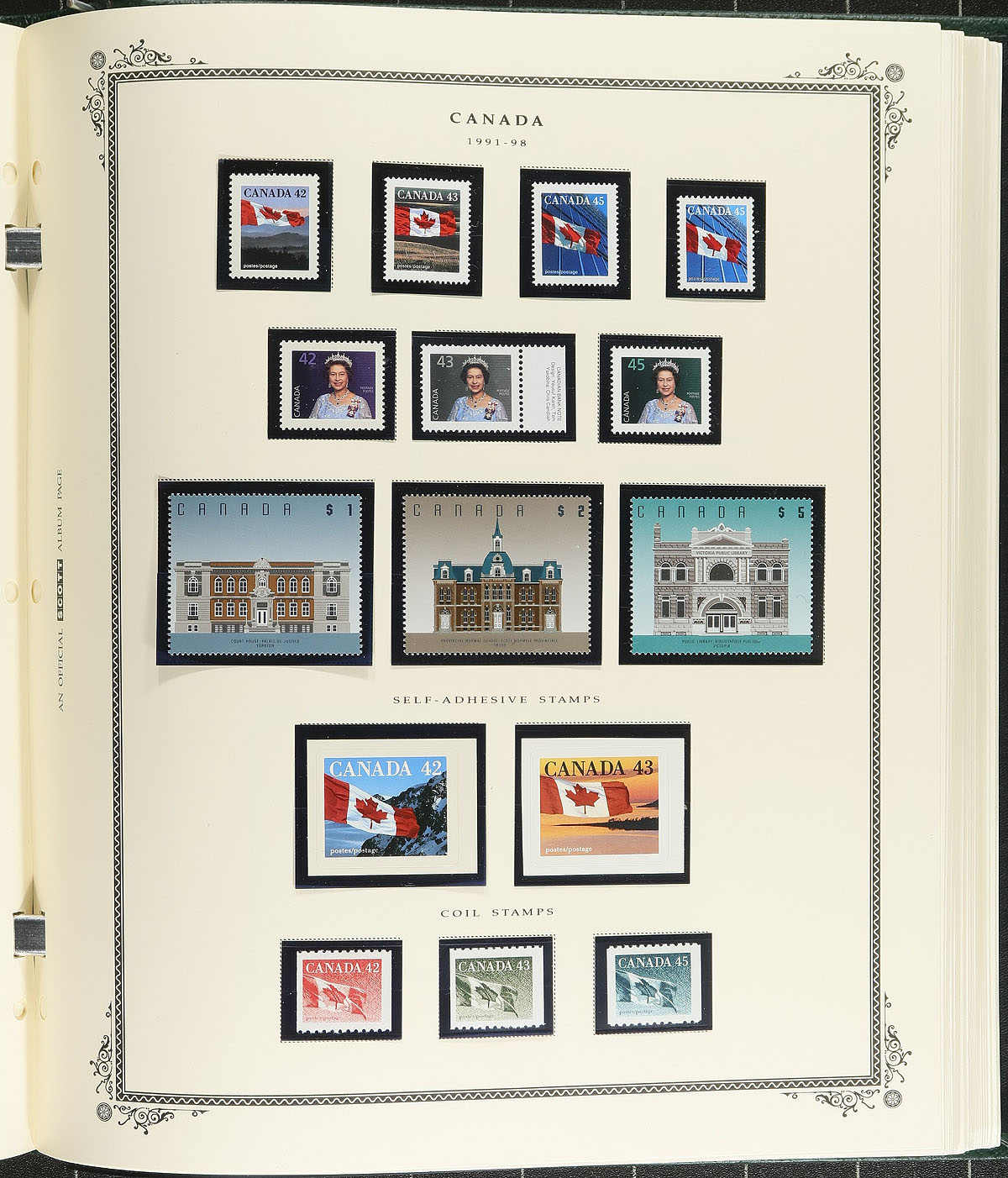Collection of mint and used Canada in a Scott Specialty album, 1859-1995. This well organized collection ranges from Scott #14/1583, beginning with used classics with Scott #s 14-15, 17-20, Large Queens (x10, 1/2c to 15c), Small Queens (x16, including 10c (x2), 20c and 50c Widow Weeds), Jubilees from 1/2c to 50c, along with mint and or used sets of Quebecs, Admirals (noting several mint coils), Scrolls (used 50c Bluenose, and mh $1 Parliament), Arch, Pictorials, War, and mint hinged set of Peace issues. The continues with a near complete collection of primarily never hinged issues from 1952 to 1995, including souvenir sheets, panes, coils, and tagged issues. A spot check indicated some stamps cataloguing $10 to $25 and up, with face value alone in excess of $400. Some of the early stamps have small faults including trimmed perfs, small thins, or have no gum, with the majority of stamps being fine to very fine. A potentially high cataloguing collection and should be continued until complete, online photos show a sampling. Estimate =