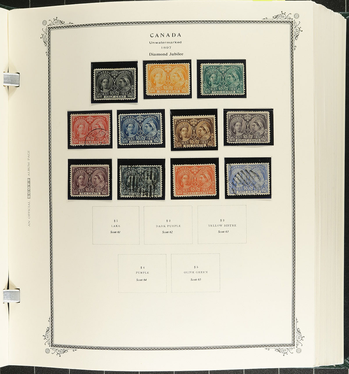 Collection of mint and used Canada in a Scott Specialty album, 1859-1995. This well organized collection ranges from Scott #14/1583, beginning with used classics with Scott #s 14-15, 17-20, Large Queens (x10, 1/2c to 15c), Small Queens (x16, including 10c (x2), 20c and 50c Widow Weeds), Jubilees from 1/2c to 50c, along with mint and or used sets of Quebecs, Admirals (noting several mint coils), Scrolls (used 50c Bluenose, and mh $1 Parliament), Arch, Pictorials, War, and mint hinged set of Peace issues. The continues with a near complete collection of primarily never hinged issues from 1952 to 1995, including souvenir sheets, panes, coils, and tagged issues. A spot check indicated some stamps cataloguing $10 to $25 and up, with face value alone in excess of $400. Some of the early stamps have small faults including trimmed perfs, small thins, or have no gum, with the majority of stamps being fine to very fine. A potentially high cataloguing collection and should be continued until complete, online photos show a sampling. Estimate =