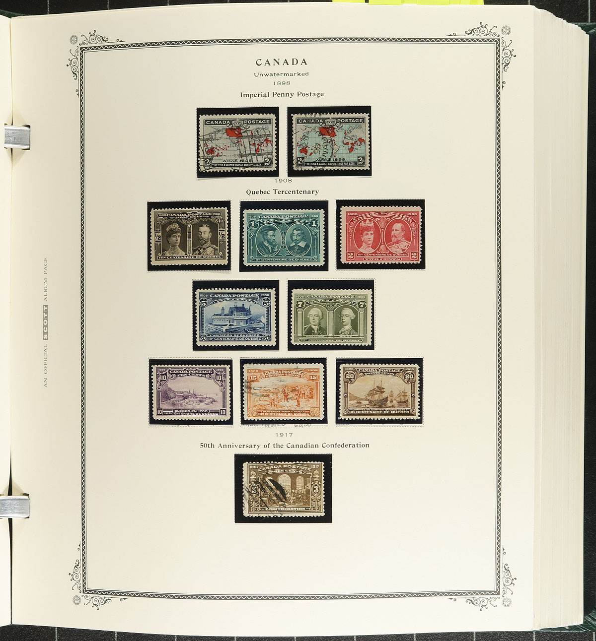 Collection of mint and used Canada in a Scott Specialty album, 1859-1995. This well organized collection ranges from Scott #14/1583, beginning with used classics with Scott #s 14-15, 17-20, Large Queens (x10, 1/2c to 15c), Small Queens (x16, including 10c (x2), 20c and 50c Widow Weeds), Jubilees from 1/2c to 50c, along with mint and or used sets of Quebecs, Admirals (noting several mint coils), Scrolls (used 50c Bluenose, and mh $1 Parliament), Arch, Pictorials, War, and mint hinged set of Peace issues. The continues with a near complete collection of primarily never hinged issues from 1952 to 1995, including souvenir sheets, panes, coils, and tagged issues. A spot check indicated some stamps cataloguing $10 to $25 and up, with face value alone in excess of $400. Some of the early stamps have small faults including trimmed perfs, small thins, or have no gum, with the majority of stamps being fine to very fine. A potentially high cataloguing collection and should be continued until complete, online photos show a sampling. Estimate =