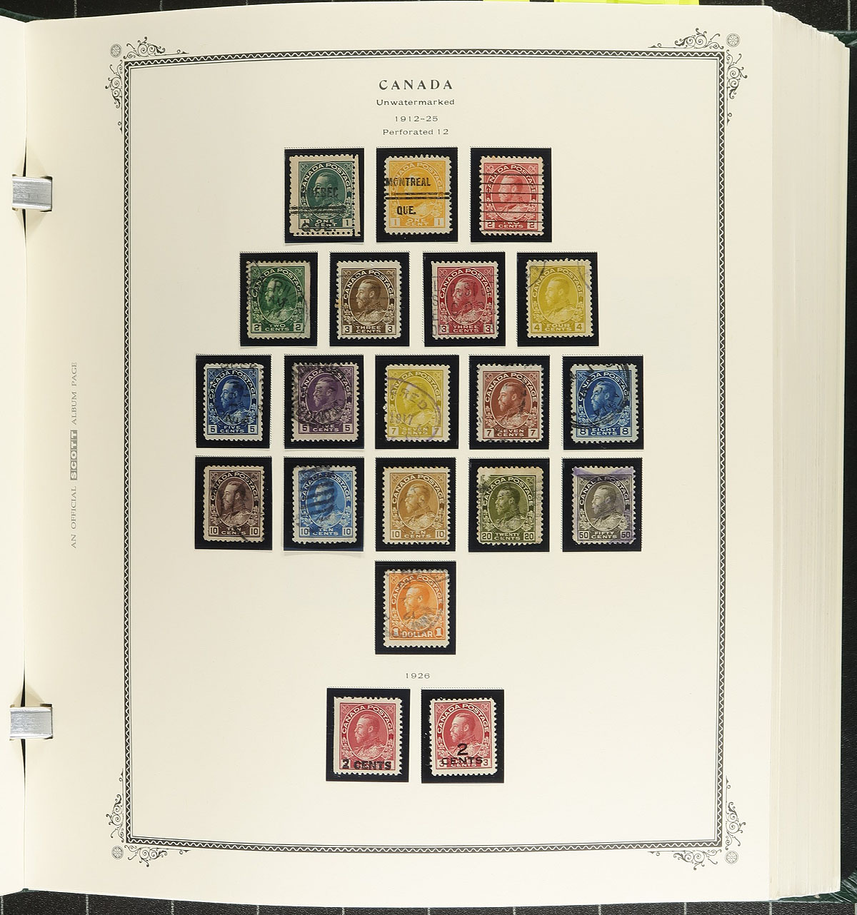 Collection of mint and used Canada in a Scott Specialty album, 1859-1995. This well organized collection ranges from Scott #14/1583, beginning with used classics with Scott #s 14-15, 17-20, Large Queens (x10, 1/2c to 15c), Small Queens (x16, including 10c (x2), 20c and 50c Widow Weeds), Jubilees from 1/2c to 50c, along with mint and or used sets of Quebecs, Admirals (noting several mint coils), Scrolls (used 50c Bluenose, and mh $1 Parliament), Arch, Pictorials, War, and mint hinged set of Peace issues. The continues with a near complete collection of primarily never hinged issues from 1952 to 1995, including souvenir sheets, panes, coils, and tagged issues. A spot check indicated some stamps cataloguing $10 to $25 and up, with face value alone in excess of $400. Some of the early stamps have small faults including trimmed perfs, small thins, or have no gum, with the majority of stamps being fine to very fine. A potentially high cataloguing collection and should be continued until complete, online photos show a sampling. Estimate =
