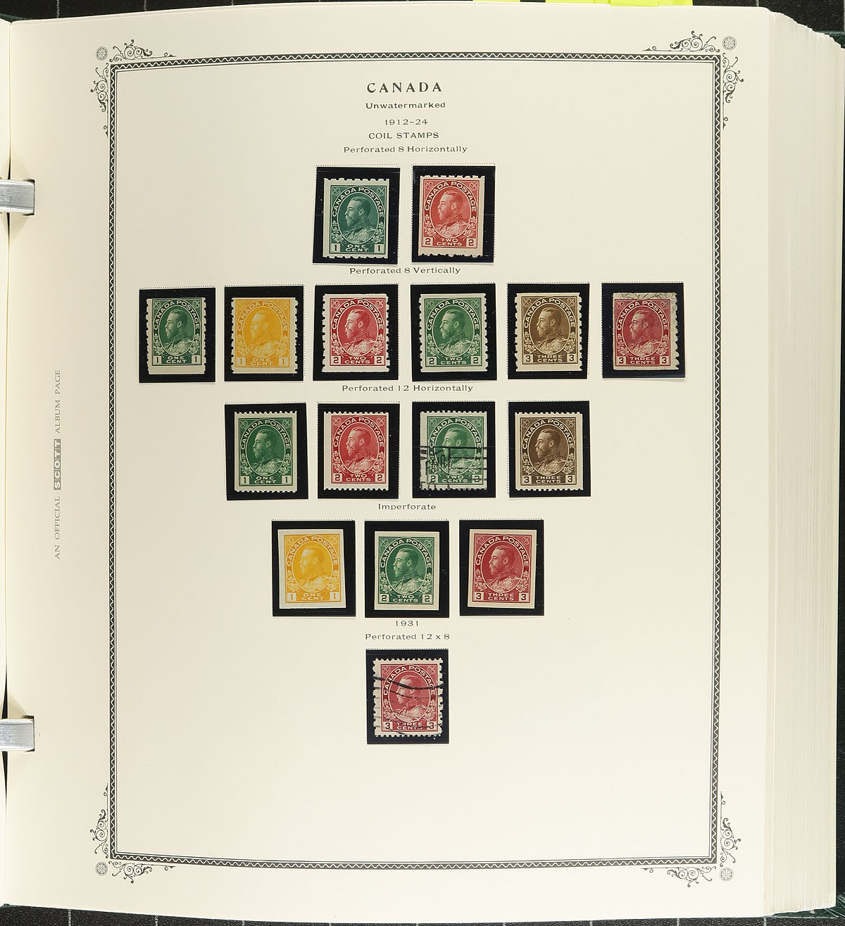 Collection of mint and used Canada in a Scott Specialty album, 1859-1995. This well organized collection ranges from Scott #14/1583, beginning with used classics with Scott #s 14-15, 17-20, Large Queens (x10, 1/2c to 15c), Small Queens (x16, including 10c (x2), 20c and 50c Widow Weeds), Jubilees from 1/2c to 50c, along with mint and or used sets of Quebecs, Admirals (noting several mint coils), Scrolls (used 50c Bluenose, and mh $1 Parliament), Arch, Pictorials, War, and mint hinged set of Peace issues. The continues with a near complete collection of primarily never hinged issues from 1952 to 1995, including souvenir sheets, panes, coils, and tagged issues. A spot check indicated some stamps cataloguing $10 to $25 and up, with face value alone in excess of $400. Some of the early stamps have small faults including trimmed perfs, small thins, or have no gum, with the majority of stamps being fine to very fine. A potentially high cataloguing collection and should be continued until complete, online photos show a sampling. Estimate =