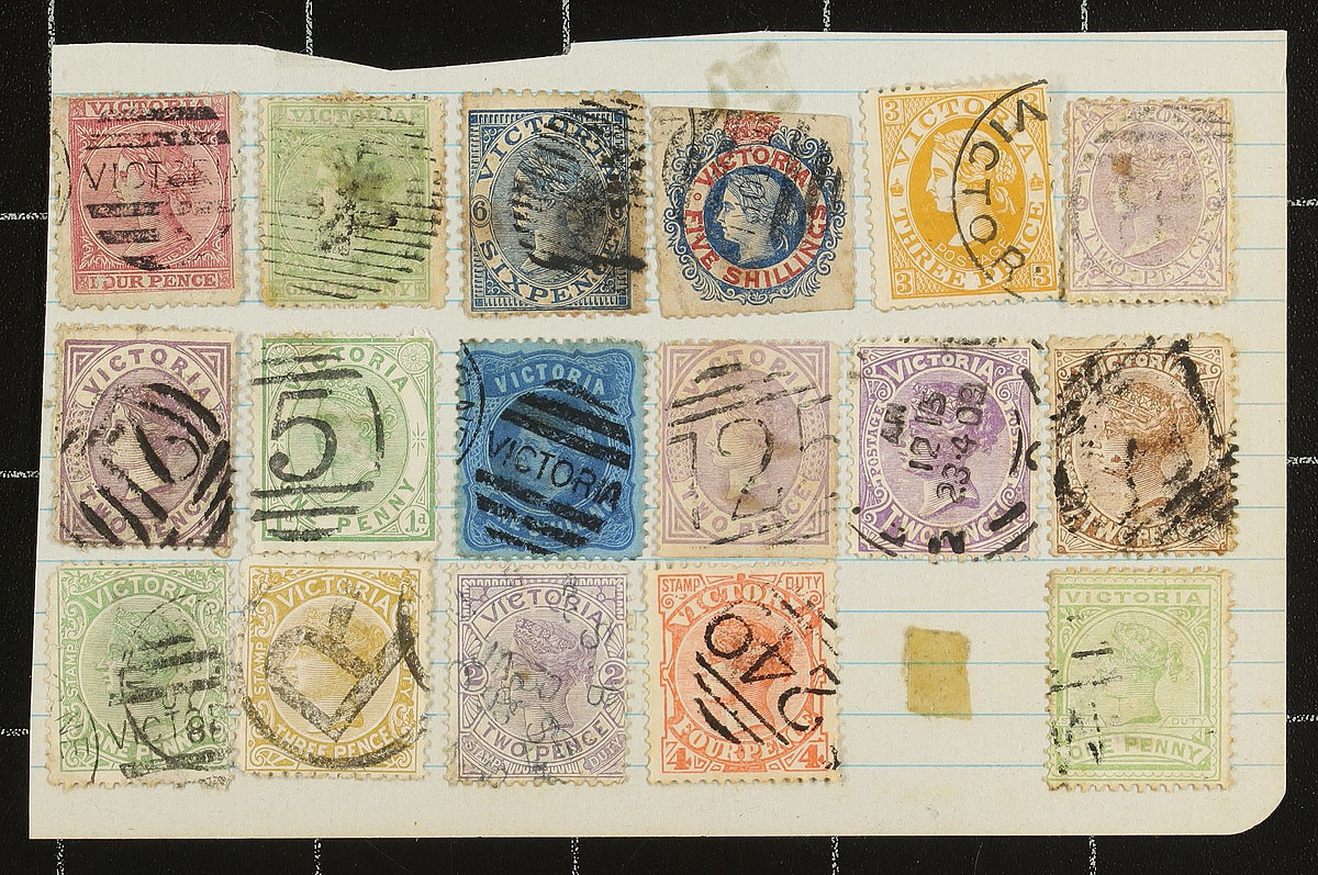 Collection / accumulation of used Australian States, 1850's-1900's, containing many hundreds of stamps in over 15 stock pages and additional album pages. A cursory check indicated representation from Victoria, Tasmania, Queensland, and Western Australia, noting a wide variety of postmark types including cds, double circle, duplex, squared circle, and more, noting many 'sock on the nose' town cancels. A nice lot for the Australia or Commonwealth postmark collector, with better cataloguing items to be discovered by dedicated collectors. Overall fine to very fine, with online photos showing a sampling. Estimate =
