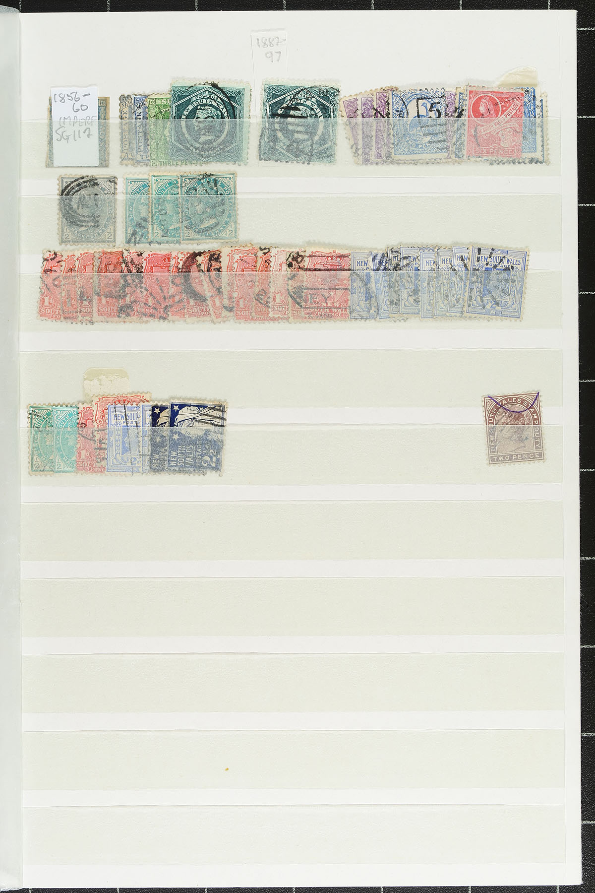 Collection / accumulation of used Australian States, 1850's-1900's, containing many hundreds of stamps in over 15 stock pages and additional album pages. A cursory check indicated representation from Victoria, Tasmania, Queensland, and Western Australia, noting a wide variety of postmark types including cds, double circle, duplex, squared circle, and more, noting many 'sock on the nose' town cancels. A nice lot for the Australia or Commonwealth postmark collector, with better cataloguing items to be discovered by dedicated collectors. Overall fine to very fine, with online photos showing a sampling. Estimate =