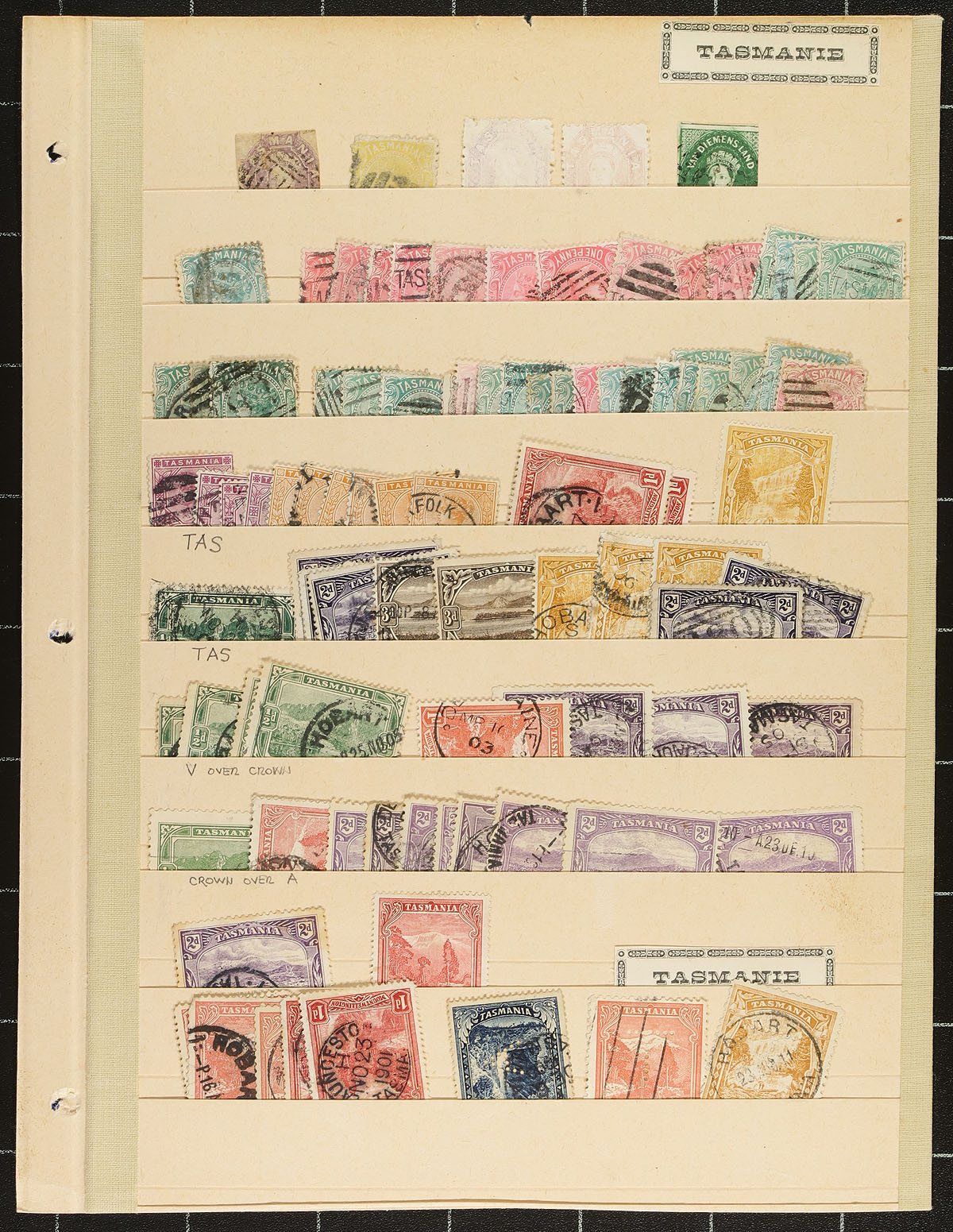 Collection / accumulation of used Australian States, 1850's-1900's, containing many hundreds of stamps in over 15 stock pages and additional album pages. A cursory check indicated representation from Victoria, Tasmania, Queensland, and Western Australia, noting a wide variety of postmark types including cds, double circle, duplex, squared circle, and more, noting many 'sock on the nose' town cancels. A nice lot for the Australia or Commonwealth postmark collector, with better cataloguing items to be discovered by dedicated collectors. Overall fine to very fine, with online photos showing a sampling. Estimate =