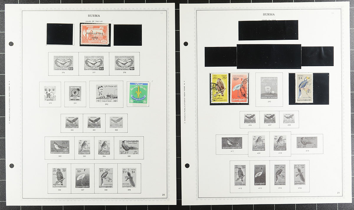 Collection of mint and used Burma, 1937-1968, containing a few hundred stamps in over Minkus album pages with hingeless mounts. A look of material indicated singles, sets, and partial sets, noting the following run of stamps with Scott #s 1-13, 14 (these all mint, with additional used), 18A-34 (mix of mint and used). 35-50 (mint, with additional used), 70-101 (mh), 116-135 (mh), !N46 (mh, c.v. $120), O43-O55 (mh, $200 total), and more. A nice overall fine collection, with all pages photographed online. Estimate =