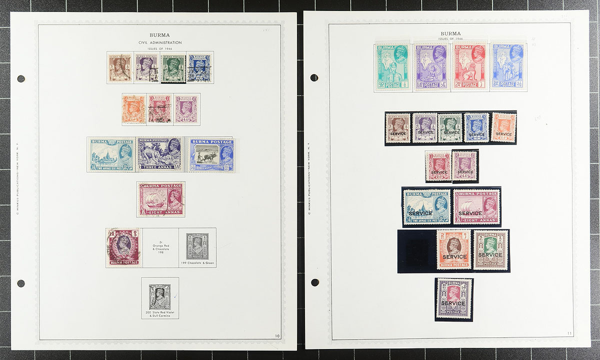 Collection of mint and used Burma, 1937-1968, containing a few hundred stamps in over Minkus album pages with hingeless mounts. A look of material indicated singles, sets, and partial sets, noting the following run of stamps with Scott #s 1-13, 14 (these all mint, with additional used), 18A-34 (mix of mint and used). 35-50 (mint, with additional used), 70-101 (mh), 116-135 (mh), !N46 (mh, c.v. $120), O43-O55 (mh, $200 total), and more. A nice overall fine collection, with all pages photographed online. Estimate =