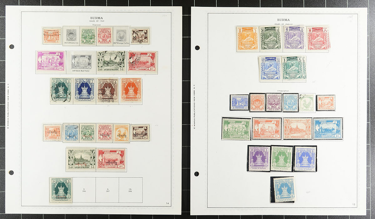 Collection of mint and used Burma, 1937-1968, containing a few hundred stamps in over Minkus album pages with hingeless mounts. A look of material indicated singles, sets, and partial sets, noting the following run of stamps with Scott #s 1-13, 14 (these all mint, with additional used), 18A-34 (mix of mint and used). 35-50 (mint, with additional used), 70-101 (mh), 116-135 (mh), !N46 (mh, c.v. $120), O43-O55 (mh, $200 total), and more. A nice overall fine collection, with all pages photographed online. Estimate =