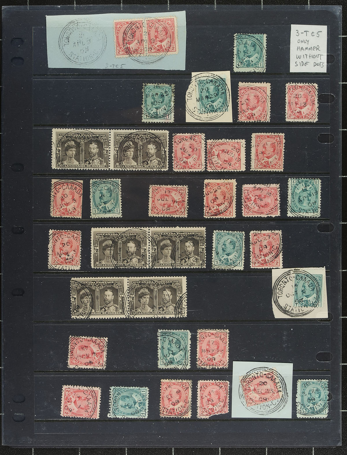 Specialized collection of Toronto 'Orb' postmarks, containing roughly 180 stamps in a few stock pages. The collection contains stamps on and off piece, all on Edward VII issues, noting postmarks with and without sidemarks, but unchecked for timemarks, errors, or other hammer characteristics. A nice lot that would benefit from future study by the specialist. Well worth our estimate. Estimate =