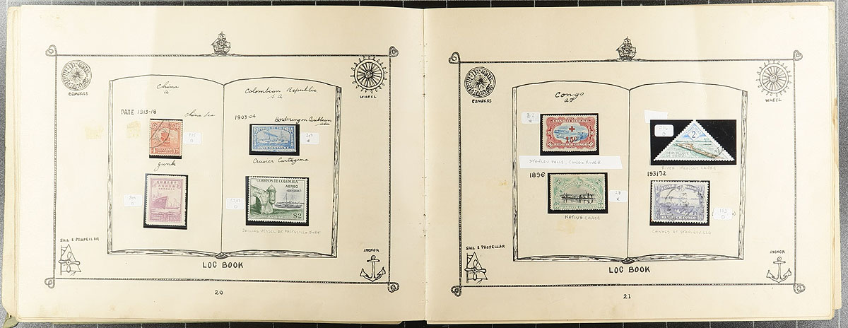 Ships on Stamps. A fun collection of mint and used Ships on Stamps collection in a 1933 "Ship's Log Stamp Album", containing roughly 250 different stamps from about 55 different countries. A nice opportunity for thematic and topical collectors, especially in a topically produced album. We note a few better stamps within, ranging from the 1890's to the 1930's, a few cataloguing $5 and up each, with the odd fault within. A fun project to continue. Estimate =