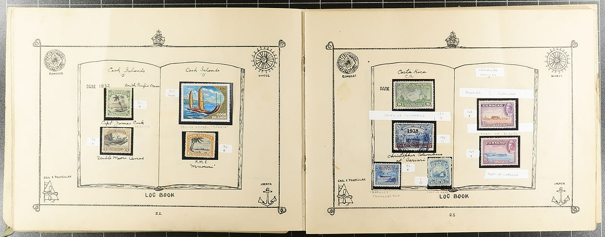 Ships on Stamps. A fun collection of mint and used Ships on Stamps collection in a 1933 "Ship's Log Stamp Album", containing roughly 250 different stamps from about 55 different countries. A nice opportunity for thematic and topical collectors, especially in a topically produced album. We note a few better stamps within, ranging from the 1890's to the 1930's, a few cataloguing $5 and up each, with the odd fault within. A fun project to continue. Estimate =