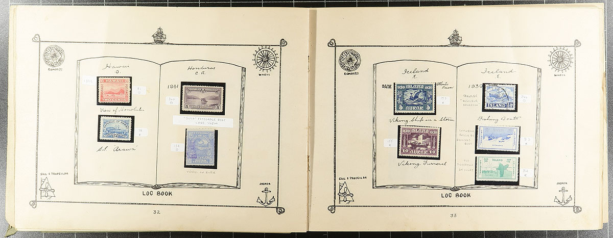Ships on Stamps. A fun collection of mint and used Ships on Stamps collection in a 1933 "Ship's Log Stamp Album", containing roughly 250 different stamps from about 55 different countries. A nice opportunity for thematic and topical collectors, especially in a topically produced album. We note a few better stamps within, ranging from the 1890's to the 1930's, a few cataloguing $5 and up each, with the odd fault within. A fun project to continue. Estimate =