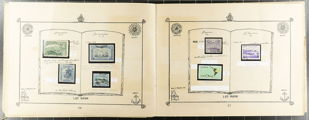 Ships on Stamps. A fun collection of mint and used Ships on Stamps collection in a 1933 "Ship's Log Stamp Album", containing roughly 250 different stamps from about 55 different countries. A nice opportunity for thematic and topical collectors, especially in a topically produced album. We note a few better stamps within, ranging from the 1890's to the 1930's, a few cataloguing $5 and up each, with the odd fault within. A fun project to continue. Estimate =