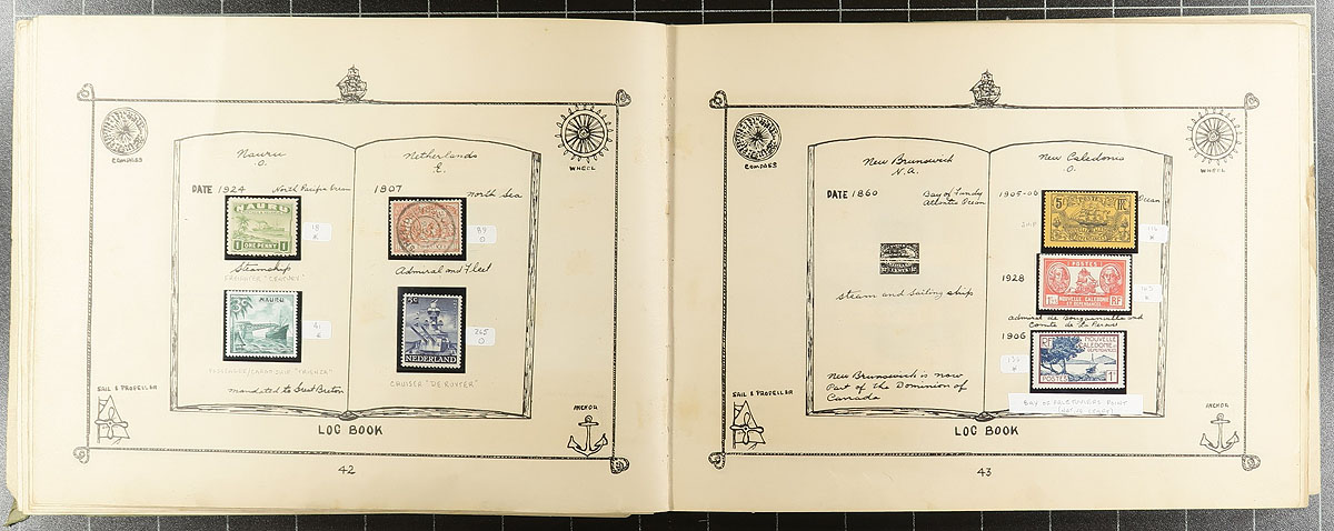 Ships on Stamps. A fun collection of mint and used Ships on Stamps collection in a 1933 "Ship's Log Stamp Album", containing roughly 250 different stamps from about 55 different countries. A nice opportunity for thematic and topical collectors, especially in a topically produced album. We note a few better stamps within, ranging from the 1890's to the 1930's, a few cataloguing $5 and up each, with the odd fault within. A fun project to continue. Estimate =