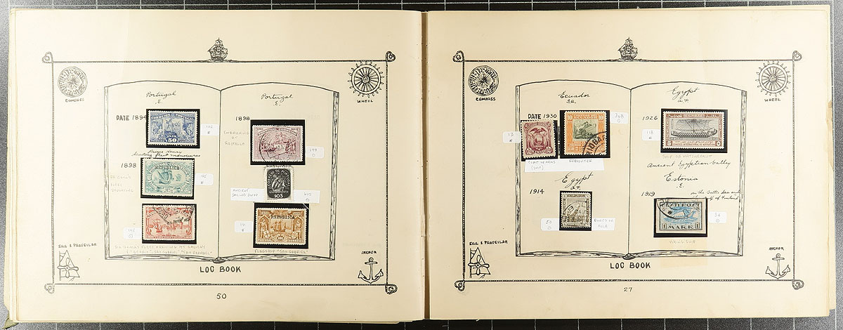 Ships on Stamps. A fun collection of mint and used Ships on Stamps collection in a 1933 "Ship's Log Stamp Album", containing roughly 250 different stamps from about 55 different countries. A nice opportunity for thematic and topical collectors, especially in a topically produced album. We note a few better stamps within, ranging from the 1890's to the 1930's, a few cataloguing $5 and up each, with the odd fault within. A fun project to continue. Estimate =