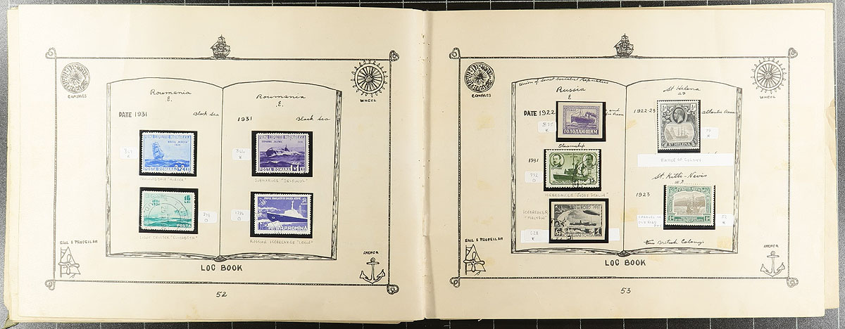 Ships on Stamps. A fun collection of mint and used Ships on Stamps collection in a 1933 "Ship's Log Stamp Album", containing roughly 250 different stamps from about 55 different countries. A nice opportunity for thematic and topical collectors, especially in a topically produced album. We note a few better stamps within, ranging from the 1890's to the 1930's, a few cataloguing $5 and up each, with the odd fault within. A fun project to continue. Estimate =