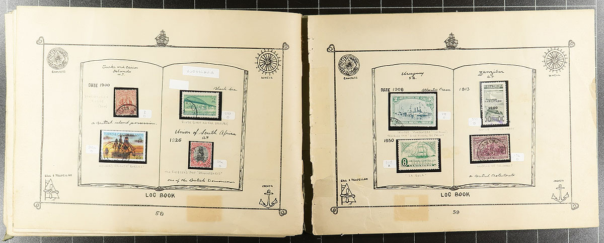 Ships on Stamps. A fun collection of mint and used Ships on Stamps collection in a 1933 "Ship's Log Stamp Album", containing roughly 250 different stamps from about 55 different countries. A nice opportunity for thematic and topical collectors, especially in a topically produced album. We note a few better stamps within, ranging from the 1890's to the 1930's, a few cataloguing $5 and up each, with the odd fault within. A fun project to continue. Estimate =