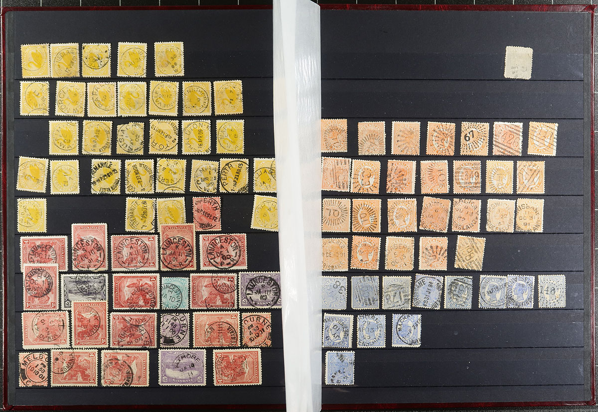 Lovely collection of used Australian States collected for town postmarks, 1850's-1900's, containing roughly 800 stamps neatly arranged in a stockbook. The collection appears to have equal representation from Victoria, New South Wales, South Australia, Western Australia, Queensland and Tasmania, with some stamps identified and priced $10 and up each. The collection has a lovely array of postmark types including cds, duplex, squared circles, sunburst, along with registered, ship mail, numerals, and a few other types, noting many 'sock on the nose' town cancels. A lovely collection for the Australia or Commonwealth town cancel collector. All pages photographed online. Estimate =