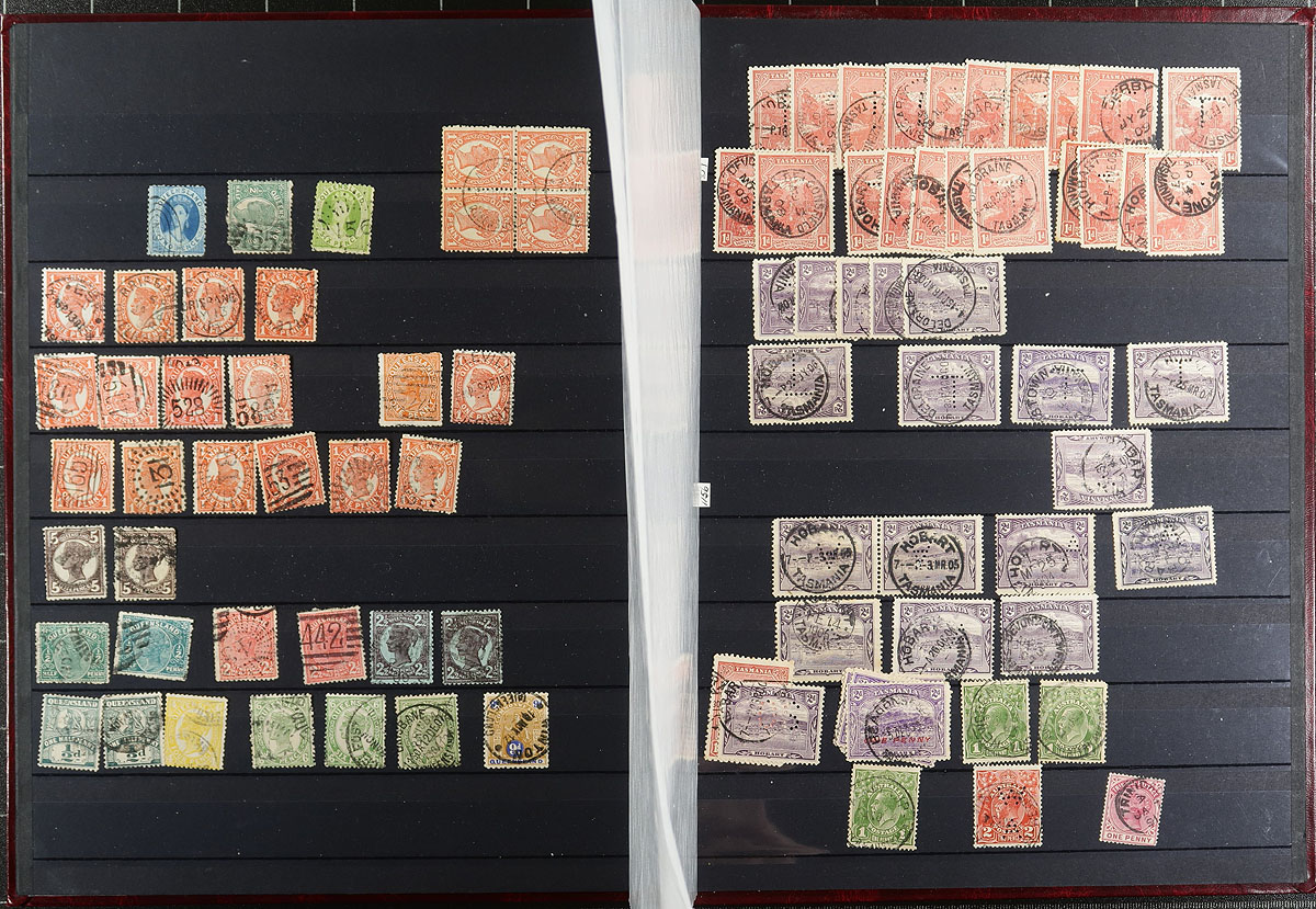 Lovely collection of used Australian States collected for town postmarks, 1850's-1900's, containing roughly 800 stamps neatly arranged in a stockbook. The collection appears to have equal representation from Victoria, New South Wales, South Australia, Western Australia, Queensland and Tasmania, with some stamps identified and priced $10 and up each. The collection has a lovely array of postmark types including cds, duplex, squared circles, sunburst, along with registered, ship mail, numerals, and a few other types, noting many 'sock on the nose' town cancels. A lovely collection for the Australia or Commonwealth town cancel collector. All pages photographed online. Estimate =