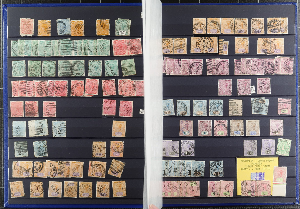 Comprehensive collection of used Tasmania collected for town postmarks, 1857-1912, containing roughly 750 stamps neatly arranged in a stockbook. The collection appears to range from Scott #9/81, including a small selection of early issues. The collection has a nice selection of postmark types including cds, duplex, numeral, along with manuscript and a few other types, noting several 'sock on the nose' town cancels. A lovely collection for the Australia or Commonwealth town postmark collector. Estimate =