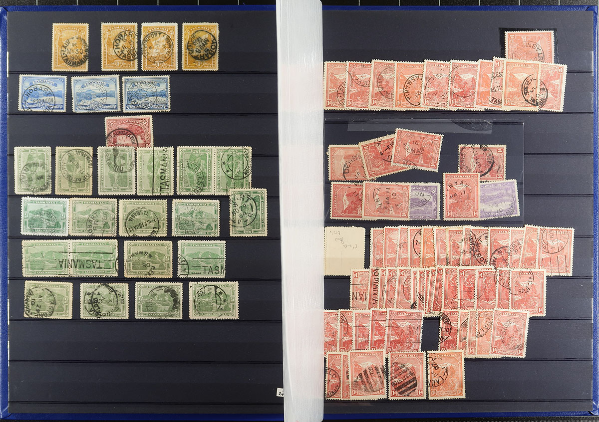 Comprehensive collection of used Tasmania collected for town postmarks, 1857-1912, containing roughly 750 stamps neatly arranged in a stockbook. The collection appears to range from Scott #9/81, including a small selection of early issues. The collection has a nice selection of postmark types including cds, duplex, numeral, along with manuscript and a few other types, noting several 'sock on the nose' town cancels. A lovely collection for the Australia or Commonwealth town postmark collector. Estimate =